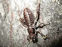 Hump-winged grigs are known for their unique mating habits.[2] Males call at night by sitting on a tree trunk with their head down and emitting a short, high-pitched trill.[1] When a female mounts the male, the male uses two hooks on its back to hold onto the underside of the female's abdomen while transfering spermatophore.[2] During copulation, the female eats the male's hind wings and drinks the male's blood for energy,[3] causing permanent but nonfatal damage to the male.[2] Hungry females are more likely to mate, will mount males sooner, and are less selective when choosing mating partners.[2][3] "Virgin" males, with no hind wing damage, are generally more successful at mating than non-virgin males.[2]