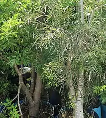 In exposed areas, it tends to be shorter and more robust - only a few meters tall. In more protected environments, it grows up to 10 meters in height. The wood is soft and fleshy, like that of a true baobab. It is therefore sometimes confused both with the Baobab (Adansonia digitata) or with the genera Calpidia or Pisonia which all have similar fleshy trunks.