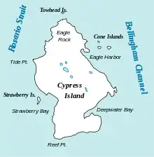 The first sighting of Cypress Island by Europeans was by the Spanish during the 1791 voyage of José María Narváez, who named it San Vincente.[4] The island was named again by Captain George Vancouver in early June 1792, when he mistook juniper trees for cypress trees. Vancouver reports that the Chatham, one of the vessels in his party, lost an anchor in Strawberry Bay, on the west side of the island.[5] Vancouver wrote: