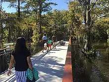 Cypress Lake is a 2-acre (0.8 ha) swamp-like lake in the heart of the University of Louisiana at Lafayette campus that started as a prehistoric bison wallow. Today it is a unique university landmark that is a habitat for native irises, alligators, turtles, birds and fish, as well as a hangout for students and a point of interest for tourists visiting Lafayette, Louisiana. Cypress Lake is casually called "The Swamp," which is also the nickname of the Louisiana Ragin' Cajuns football stadium, officially named Cajun Field.