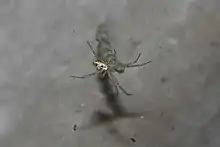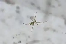It is a small spider, which has long legs and a green colour with yellowish markings. It can turn black with white and green markings when flushed. It is often seen upside down.[1] Its web is very strong but lacks sticky fibers. It is built in a three-dimensional and complex dome commonly found between branches of thorny plants,[1] but can be seen basically anywhere. Hence, they do not move very much from the centre of the dome in which they hang upside-down.[1] The dome is connected by many lines to a support, and forms a mountain shape in the middle.[1] A chain of green bean-like egg sacs is also a common sight in these webs.