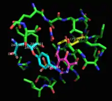 Pyridoxal phosphate is bound in the active site by Lys212.[2]