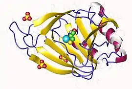 Cysteine dioxygenase (CDO) is a non-heme iron enzyme that catalyzes the conversion of L-cysteine to cysteine sulfinic acid (cysteine sulfinate). CDO plays an important role in cysteine catabolism, regulating intracellular levels of cysteine and responding changes in cysteine availability.[1] As such, CDO is highly regulated and undergoes large changes in concentration and efficiency. It oxidizes cysteine to the corresponding sulfinic acid by activation of dioxygen, although the exact mechanism of the reaction is still unclear. In addition to being found in mammals, CDO also exists in some yeast and bacteria, although the exact function is still unknown.[2][3] CDO has been implicated in various neurodegenerative diseases and cancers, which is likely related to cysteine toxicity.[1][2]