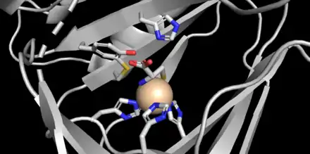 CDO is a 22.5 kDa protein[2] that contains 200 amino acid residues[3] and has an isoelectric point (pI) of 5.5.[2] The primary structure is highly conserved between mammalian species, with murine and human CDO differing in only 16 residues.[3] CDO is part of the cupin superfamily,[2] whose members possess a 6-stranded β-barrel[8] in a "jelly-roll" topology.[3] Crystal structures of the protein have been obtained at 1.5 Å resolution (mouse).[1] The active site displays a unique geometry where instead of the typical facial triad of two histidines and one carboxylate side-chain coordinating to an iron (II) species,[9] three histidine ligands are bound to iron.[2][3][8] Furthermore, crystal structures show the amino nitrogen and thiolate sulfur of cysteine coordinated to the iron in addition to a single water molecule (see figure).[2]