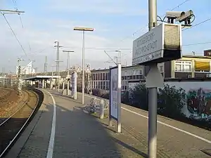 Düsseldorf-Friedrichstadt station is a through station in the district of Friedrichstadt in the city of Düsseldorf in the German state of North Rhine-Westphalia. The station was opened on 29 May 1988[5] on the new line opened by the Prussian state railways on 1 October 1891 between the Hamm Railway Bridge and Gerresheim as part of the construction of Düsseldorf Hauptbahnhof.[6] It has two platform tracks and it is classified by Deutsche Bahn as a category 5 station.[1]