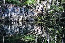 The park contains eucalyptus woodlands, sheltered pockets of sub-tropical rainforest, a number of crevasses and views of Moreton Bay and the Glass House Mountains.[1] The Walkabout Creek Visitor Centre is located at the edge of the park. There are two formal, vehicle accessible camping areas in the Mount Mee section and eight remote bush camping sites (accessible only by walking) in the southern D'Aguilar (formerly Brisbane Forest Park) section.[2] Popular lookouts include Jolly's Lookout, Westridge Outlook, Camp Mountain Lookout and Wivenhoe Lookout, overlooking Lake Wivenhoe. The villages of Mount Nebo and Mount Glorious are located on Mount Nebo Road on the edges of the national park and are popular stops for tourists driving through the park.