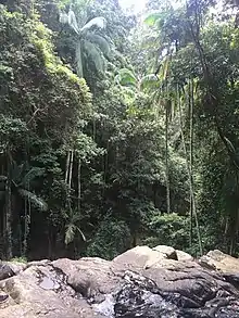 Moist sub-tropical rainforest grows on the highest parts of the range where the rainfall is two-thirds greater than in the foothills, particularly on the rich basaltic soils north of Mt Glorious. Huge strangler figs (Ficus watkinsiana) can be seen emerging through the canopy.[3]