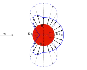 In the second half of the 19th century, focus shifted again towards using inviscid flow theory for the description of fluid drag—assuming that viscosity becomes less important at high Reynolds numbers. The model proposed by Kirchhoff[17] and Rayleigh[18] was based on the free-streamline theory of Helmholtz[19] and consists of a steady wake behind the body. Assumptions applied to the wake region include: flow velocities equal to the body velocity, and a constant pressure. This wake region is separated from the potential flow outside the body and wake by vortex sheets with discontinuous jumps in the tangential velocity across the interface.[20][21] In order to have a non-zero drag on the body, the wake region must extend to infinity. This condition is indeed fulfilled for the Kirchhoff flow perpendicular to a plate. The theory correctly states the drag force to be proportional to the square of the velocity.[22] In first instance, the theory could only be applied to flows separating at sharp edges. Later, in 1907, it was extended by Levi-Civita to flows separating from a smooth curved boundary.[23]