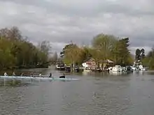 Carte intended to use the island as a special secluded annex, accessible by boat, to his new Savoy Hotel, but a panel of local magistrates refused to grant him an alcoholic drinks licence for the property.[5] Instead, Carte had a 13-bedroom mansion, Eyot House, built on the island, and it became one of his main residences.[6][7] Among the famous guests who stayed at the house were the dramatist W. S. Gilbert and the composer Arthur Sullivan.[8] In later years, Carte displayed his macabre sense of humour by keeping a crocodile on the island.[9]