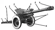 The carriage was nearly identical to the carriage of the M-30. It had suspension and steel wheels with pneumatic rubber tires. The trails were initially of riveted construction, but were eventually replaced in production by welded ones. Late production pieces were equipped with caster wheels to ease manhandling. Time to set up for combat was about two minutes. In an emergency it was possible to fire without splitting trails; however this was at the price of a drastically reduced traverse (1°30'). Since the gun was not equipped with a limber, it could be towed only by vehicle. The maximum towing speed was 40 km/h on paved roads, 30 km/h on cobbled roads and 10 km/h off-road. To give the crew some protection from bullets and shell fragments, the gun was fitted with a shield.[2][3][4]