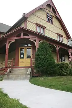 The Swift House is located at the southeast corner of Oak and Kendall Streets in eastern Worcester, and is surrounded to the north, east, and south by buildings of the UMass Medical Center. It is a 2+1⁄2-story wood-frame structure, with a front-facing gable roof, clapboard siding, and granite foundation. A rectangular section with gable top projects to the left (Kendall Street) side. It is a well-preserved example of Gothic Revival and Stick style design, with bargeboard and decorative apron in the main gable. The porch, which wraps around two sides of the house, has a low geometric railing, and bracketing that echoes the woodwork in the gables. In an unusual touch, the main entrance is set at an angle at the corner.[2]
