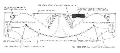 The Paragon is a horn-loaded, stereo speaker system within a single 9-foot-wide (2.7 m) housing.[3] It is based on a diffusion principle developed by Richard Ranger as consultant to JBL. Launched in 1957, the Paragon is the world's earliest production stereo loudspeaker for home use,[5] and also the most expensive speaker at the time.[2] As the flagship JBL product, it cost $1,830 (£650) – equivalent to more than $15,000 in 2013 terms.[3] The "Paragon" is the product with the longest production run of all JBL loudspeakers.[1] It was produced continually until it was discontinued in 1983, when it was replaced by a product line named "Everest".[2][4]