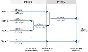 The competition has been broken into multiple tracks. Tracks A and B receive DARPA funding, while Tracks C and D will receive no DARPA funding initially. Tracks B and C will go through the Virtual Robotics Challenge (VRC), after which successful teams may receive funding for subsequent stages.[4] Applications for tracks A and B closed in May 2012.[6] The track C application window closed on 18 December 2012, though late applications were still being considered as of January 2013,[7] though participants may still download the DRC Simulator, an open-source application created by the Open Source Robotics Foundation.[8] Track D was open for registration through October 2013.[9]