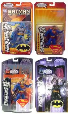 DC Superheroes is a collection of action figures originally produced by Mattel in early 2006. It is divided into three different lines - the Justice League Unlimited toyline, with figures based on the animated Justice League Unlimited series; the S3: Select Sculpt Series, featuring more comic-accurate figures in the 6" scale; and a 12" figure line. The S3 line is further divided into two lines - one featuring Batman, and the other featuring Superman. Series 1 of the S3 line began shipping just after Christmas 2005 to Wal-Mart and began arriving in retailers like Target and Toys "R" Us approximately one month later. The figures have characteristics similar to the competing Marvel Legends line in terms of detailed sculpting, articulation, and including a comic book or diorama with each figure.