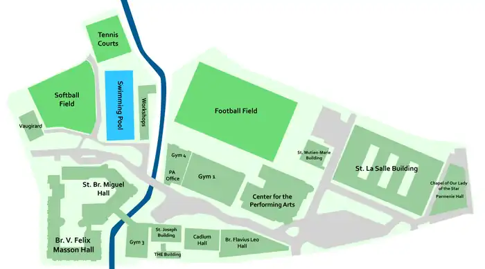 When the school opened in 1978, there was only one building available for use, the St. La Salle Building, then called the "Main Building". At present, the campus is composed of a number of structures which have been necessitated by the burgeoning school population. The following major buildings are found on campus: