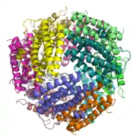 - Ilari A, Stefanini S, Chiancone E, Tsernoglou D (January 2000). "The dodecameric ferritin from Listeria innocua contains a novel intersubunit iron-binding site". Nature Structural Biology. 7 (1): 38–43. doi:10.1038/71236. PMID 10625425. S2CID 52872968.