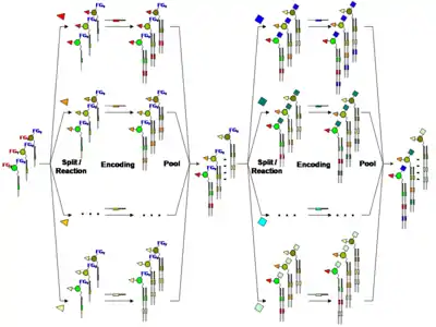 In order to apply combinatorial chemistry for the synthesis of DNA-encoded chemical libraries, a Split-&-Pool approach was pursued.[10][11] Initially a set of unique DNA-oligonucleotides (n) each containing a specific coding sequence is chemically conjugated to a corresponding set of small organic molecules. Consequently, the oligonucleotide-conjugate compounds are mixed ("Pool") and divided ("Split") into a number of groups (m). In appropriate conditions a second set of building blocks (m) are coupled to the first one and a further oligonucleotide which is coding for the second modification is enzymatically introduced before mixing again. This “split-&-pool” steps can be iterated a number of times (r) increasing at each round the library size in a combinatorial manner (i.e. (n x m)r). Alternatively, peptide nucleic acids have been used to encode libraries prepared by "split-&-pool" method.[13] A benefit of PNA-encoding is that the chemistry can be performed by standard SPPS.[14]