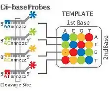 | Sequencing by ligation (SOLiD sequencing) | 50+35 or 50+50 bp | 99.9% | 1.2 to 1.4 billion | 1 to 2 weeks | $60–130 | Low cost per base. | Slower than other methods. Has issues sequencing palindromic sequences.[93] |