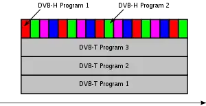 DVB-H (digital video broadcasting - handheld) is one of three prevalent mobile TV formats. It is a technical specification for bringing broadcast services to mobile handsets. DVB-H was formally adopted as ETSI standard EN 302 304 in November 2004. The DVB-H specification (EN 302 304) can be downloaded from the official DVB-H website.[1] From March 2008, DVB-H is officially endorsed by the European Union as the "preferred technology for terrestrial mobile broadcasting".[2][3][4][5] The major competitors of this technology are Qualcomm's MediaFLO system, the 3G cellular system based MBMS mobile-TV standard, and the ATSC-M/H format in the U.S. DVB-SH (Satellite to Handhelds) now and DVB-NGH (Next Generation Handheld) in the future are possible enhancements to DVB-H, providing improved spectral efficiency and better modulation flexibility. DVB-H has been a commercial failure, and the service is no longer on-air. Ukraine was the last country with a nationwide broadcast in DVB-H, which began transitioning to DVB-T2 during 2019.