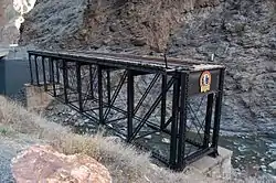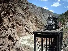 Crossing the Cimarron River just upstream from its confluence with Crystal Reservoir, the bridge holds a static display composed of several pieces of railroad equipment. Representing the types of rolling stock used by the Denver and Rio Grande Railroad on the Black Canyon Route, the display includes a 2-8-0 steam locomotive, D&RGW No. 278, built by Baldwin Locomotive Works in 1882, a coal tender paired with the engine in 1935, a boxcar, D&RGW No.3132, built in 1904 by American Car and Foundry and a caboose, No. 0577, manufactured in 1886.[4] Gifted by the railroad to the nearby town of Montrose in 1952, the engine, along with its tender and caboose, was leased to the National Park Service in 1973.[5]