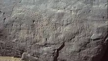 The Dabous Giraffes are neolithic petroglyphs[1] by unknown artists on the western side of the Aïr Mountains in north-central Niger.[2] The carvings are 6 metres (20 ft) in height and consist of two giraffes carved into the Dabous Rock with a great amount of detail. One of the giraffes is male, while the other, smaller, is female. The Dabous Giraffes are located on a sandstone outcrop in the Ténéré desert in the first foothills of the Aïr Mountains, about 110 km north of Agadez and a few kilometres from the Trans-Saharan Highway. They are the largest known animal petroglyphs in the world.[2]