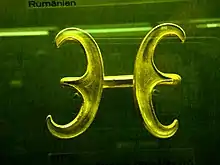 The heads have also been interpreted as goat-heads (ibex).[34] Each head is very made of embossed gold foil with a filigree composition,[96] and had sun-symbols on the middle of the forehead. They also have what may be seen as ram's- or goats-horns (see picture "Head 1" on the right).[92] These Băiceni gold artworks of the 4th century BC are viewed as one of the links transferring the Thracian and North Thracian Art forms and motifs across to the Dacian silversmiths.[97]