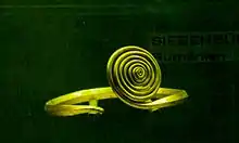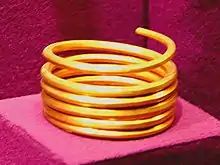 The finds from Firighiaz (Firiteaz), Arad County, on left bank of the Lower Mureș River, are representative of the spiral motif bracelets of this period.[8] [56] The Firiteaz's treasure contains twenty-three bracelets made of gold bar, each weighing 0.2 kilograms (0.44 pounds), and the hoard is housed in the Vienna Museum.[9] Bracelets made of bronze, similar to the Firiteaz ones made of gold, had been found in Transylvanian deposits dated to the Early Iron Age.[57]