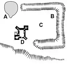 Dacre Castle lies in a valley, overlooking a stream and fields.[15] It comprises a tower house surrounded by a three-sided moat, creating an enclosed courtyard to the east 73 metres (240 ft) by 55 metres (180 ft) across.[15] The moat is between 9 metres (30 ft) to 15 metres (49 ft) wide and up to 4.5 metres (15 ft) deep, with a protective bank on the south and west sides; originally a wall would have surrounded the outside of the courtyard.[16] The courtyard originally held various buildings, possibly stables and offices, but the tower house was designed to operate independently, without the need for attached facilities.[17] Architecturally, the design of Dacre resembles Harewood and Langley Castles.[2]