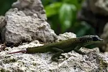 The tail of anoles varies, but mostly it is longer than the snout-to-vent length. Depending on exact species it can range from slightly shorter to about three times the snout-to-vent.[1][8][51][52] The Caribbean twig ecomorph anoles, proboscis anole and "Phenacosaurus" anoles have a prehensile tail.[53][54][55] Semi-aquatic anoles tend to have relatively tall, vertically flattened tails that aid in swimming.[56]