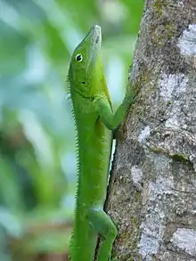 Anoles mainly detect potential enemies by sight, but their hearing range also closely matches the typical vocal range of birds. If hearing a predatory bird, like a kestrel or hawk, they increase their vigilance. When hearing a non-predatory bird little or no change happens.[70] Most anole species will try to escape from a predator by rapidly running or climbing away, but some will move to the opposite side of a tree trunk (facing away from the would-be attacker), jump to the ground from their perch, or freeze when disturbed, hoping the adversary does not spot it.[53][154] Some anole species will show their fitness by displaying their dewlap when encountering a predator; the greater the endurance of the anole, the greater the display.[155] Conversely, when suddenly forced to share their habitat with an efficient anole predator like the northern curly-tailed lizard (for example, if it is introduced to a place where formerly not present), the anoles may decrease the amplitude of their head bobbing, making them less conspicuous,[156] and may become slower to emerge from hiding (less willing to take a risk) after having been scared by a predator.[157] Slow-moving anoles, like the twig ecomorphs of the Caribbean and many Dactyloa species of mainland Central and South America, are generally cryptically colored and often coordinate their movements with the wind, resembling the surrounding vegetation.[148] A few semi-aquatic species will attempt to escape from predators by diving into water or running bipedally across it, similar to basilisks.[56][158] However, the anoles lack the specialized toe fringes that helps basilisks when doing this.[158]