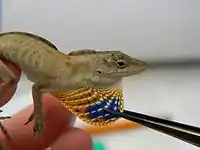In addition to animal prey, many anole species will take plant material, notably fruits, flowers and nectar,[13][14][144] and overall they are best described as omnivorous.[145] Some fruit-eating species, like the knight anole, may function as seed dispersers.[145] Anoles have been recorded drinking sweetened water from hummingbird feeders.[111] Anoles are vulnerable to drying out and generally need access to water for drinking,[8] like dew or rain on leaves,[146] although some species are less susceptible to water loss than others and are able to live in relatively arid places.[124][147]