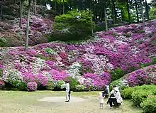 The Chigiri-en (契園), behind the main hall, is a forested botanical garden at the foot of Mount Chigiri on the border between Chikushino in Fukuoka Prefecture and Kiyama in Saga Prefecture. In the gardens, in the latter half of April and the early half of May about 50,000 azalea plants are in bloom here in a whirl of color attracting hundreds of flower lovers.[6]