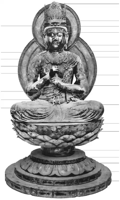 Approximately ninety percent of Important Cultural Property and National Treasure sculptures are made of wood.[42] All of Unkei's surviving works are in this medium.[4][43] This piece employs the joined-block technique known as yosegi-zukuri, which has the twin advantages of obviating the need for large pieces of timber while facilitating the hollowing-out process which helps reduce shrinkage and cracking.[42][44][45][46] Six main blocks of hinoki or Japanese cypress were used, two vertical blocks arranged side by side and end on for the torso and head; one horizontal piece for the legs; one for the top-knot; and two wedges for the thighs; the arms are assembled from a number of further pieces.[47] After carving, hollowing, and assembly, the statue was lacquered and covered in gold leaf.[44] The double halo and pedestal are of similar materials.[44] The eyes are of rock crystal, inserted into the open sockets from inside and held in place by bamboo pins, with painted pupils.[42][44][48] Eyes formed in this way seem to move in the guttering firelight of a temple and are one of the defining features of the sculpture of the Kamakura period that began a decade later.[48] The lips are painted red and the hair blue.[44][47] The jewels and crown are of gilt bronze.[49]