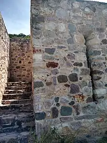 Access to this building is very characteristic: entrance was through the terrace bottom or plaza, via a staircase attached to the wall and crossed by a roofed hallway roofed with large monolithic stone slabs.