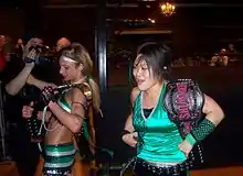 Haze began wrestling for the Philadelphia–based Chikara in 2005.[1] In November 2009 she was placed in her first major storyline in the company, when she aligned herself with Claudio Castagnoli, Ares, Pinkie Sanchez, Sara Del Rey, Tim Donst and Tursas to form the heel stable Bruderschaft des Kreuzes (BDK).[17] The stable has since been joined by Lince Dorado and Delirious.[18][19] While in BDK Haze began regularly teaming with Del Rey and together the two of them picked up victories over tag teams such as The Osirian Portal (Amasis and Ophidian),[18] Los Ice Creams (El Hijo del Ice Cream and Ice Cream, Jr.),[20] The Throwbacks (Dasher Hatfield and Sugar Dunkerton),[19] Amazing Kong and Raisha Saeed,[21] and Mike Quackenbush and Jigsaw.[22] On September 18, 2010, Haze wrestled Japanese joshi legend Manami Toyota in her first match on American soil, in a losing effort.[23] On October 23 Haze represented BDK in the torneo cibernetico match, where they faced a team composed of Chikara originals. She was eliminated from the match by Eddie Kingston.[24] The following day Haze and Del Rey defeated the Super Smash Bros. (Player Uno and Player Dos) in a tag team match to pick up their third straight victory and, as the first all–female tag team, earn the right to challenge for the Chikara Campeonatos de Parejas (tag team championship), at the time held by their stablemates Ares and Claudio Castagnoli.[25] However, Haze and Del Rey never got to cash in their points as Ares and Castagnoli ordered them to defend them in a four–way elimination match on November 21, where they ended up being eliminated by Mike Quackenbush and Jigsaw and losing all of their points.[26] On July 31, 2011, Castagnoli turned first on Del Rey, after losing to her in a singles match, and then Haze, as she was standing up for her regular tag team partner.[27] The following week, Del Rey quit BDK, while Chikara announced that Haze would be taking a leave of absence from the promotion after suffering a storyline injury at the hands of Castagnoli.[28]