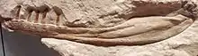 In 1856 von Quenstedt made Plieninger's Geosaurus maximus teeth a new genus with the name Dakosaurus. He explained the etymology as Greek dakos "Biss" [bite] in 1858 in German, adding "denn wenige kommen seinem furchtbaren Gebiss gleich" [for few can match its terrible set of teeth].[10] He gave the meaning of Greek dakos more correctly as "Beisser" [biter] in another description in 1859 in which he classified Dakosaurus as a dinosaur.[11]