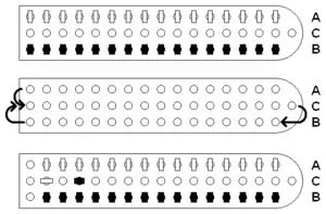 The board is boat-shaped and has three parallel rows of holes, two of which (A and B) have 16 holes each, while the middle row has an extra hole in the prow of the ship.
