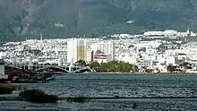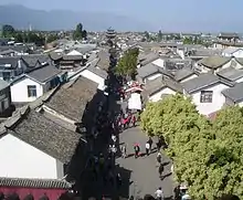 Dali Town (大理镇) formerly known as Tali,[lower-alpha 1] is another division of Dali City, located 10 km (6.2 mi) north of Xiaguan. This town, commonly referred to as Dali Old Town (大理古城) to distinguish it from the city seat in Xiaguan, is usually the Dali referred to in tourist publications. The old town is one of the most popular tourist destinations in Yunnan, known for its natural scenery, historical and cultural heritage, and vibrant nightlife.[3]
