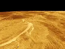 The Dali and Diana Chasma system consist of deep troughs that extend for 7,400 kilometers (4,600 mi) and are very distinct features on Venus. Those chasma connect the Ovda Regio and Thetis Regio highlands with the large volcanoes at Atla Regio and thus are considered to be the "Scorpion Tail" of Aphrodite Terra. The broad, curving scarp resembles some of Earth's subduction zones where crustal plates are pushed over each other. The radar-bright surface at the highest elevation along the scarp is similar to surfaces in other elevated regions where some metallic mineral such as pyrite (fool's gold) may occur on the surface.[1]