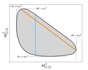 where is the invariant mass of particles 1 and 2 in a given decay event; and are its maximal and minimal kinematically allowed values, while is the angle between particles 1 and 3 in the rest frame of particles 1 and 2. This technique is commonly called "Square Dalitz plot" (SDP).