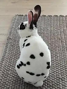 The Dalmatian rabbit, also called the Dalmatian Rex,[1] is a medium-sized rabbit, weighing 6 to 8 pounds. Its fur is mainly white with patches of black, blue, brown, orange, or fawn.[2]