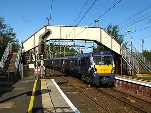 Dalreoch railway station serves the west end of Dumbarton in West Dunbartonshire, Scotland. The station is managed and served by ScotRail and is served by trains on the North Clyde Line. The station is 16 miles 38 chains (26.5 km) northwest of Glasgow Queen Street (High Level), measured via Singer and Maryhill.[3]