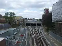 Dalston Junction (pronounced /ˈdɔːlstən/) is an inter-modal rail and bus transport interchange in Dalston, London. It is located at the crossroads of Dalston Lane, Kingsland Road and Balls Pond Road. The station served by London Overground East London line and is in Zone 2.[4] The station is located in a short section of cut and cover tunnel north of the Kingsland Viaduct.