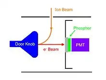 Ions that hit the doorknob release secondary electrons. A high voltage (about −20000 V) between the doorknob and the scintillator accelerates the electrons onto the phosphor screen, where they are converted to photons. These photons are detected by the photomultiplier.