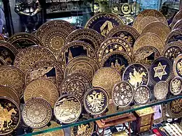 The Zuloaga family workshop at Eibar was the centre of Spanish damascening from the 19th century to the Spanish Civil War.[2][3] Eusebio Zuloaga was a gunsmith and director of the Spanish Royal Armoury.[4] A metalwork prodigy, Zuloaga undertook to restore damaged items in the armoury, and in the process studied and replicated decorative techniques of centuries past. This led to the establishment of Spain's damascene industry.[5] Eusebio's eldest son Plácido Zuloaga eventually took over the workshop and directed its work away from armaments to the production of intricate decorative art works.[4] In the process, he mastered and improved the techniques of damascening[6] and trained more than two hundred artists.[2] His works were exhibited at many national and international fairs, winning multiple gold and silver medals[2] and extremely positive reviews from critics.[7] The British-Iranian scholar and collector Nasser D. Khalili has assembled, published, and exhibited more than a hundred items of Spanish damascened metalwork from this period, forming the Khalili Collection of Spanish Damascene Metalwork.[8]