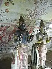 In the second and largest cave, in addition to 16 standing and 40 seated statues of Buddha, are the gods Saman and Vishnu, which pilgrims often decorate with garlands, and finally, statues of King Vattagamani Abhaya, who honoured the monastery in the 1st century BC., and King Nissanka Malla, responsible in the 12th century for the gilding of 50 statues, as indicated by a stone inscription near the monastery entrance. This cave is accordingly called Maharaja lena, "Cave of the Great Kings." The Buddha statue hewn out of the rock on the left side of the room is escorted by wooden figures of the Bodhisattvas Maitreya and Avalokiteshvara or Natha. There is also a dagoba and a spring which drips its water said to have healing powers, out of a crack in the ceiling. Distinctive tempera paintings on the cave ceiling dating from the 18th century depict scenes from Buddha's life, from the dream of Mahamaya to temptation by the demon Mara. Further pictures relate important events from the country's history.