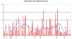 However, his performances were unconvincing, totalling 168 runs at 28.16 for the series, passing 50 only once with an unbeaten 67* at the MCG.[1][5] Martyn was also a member of the ODI squad in that season, playing less regularly in only four of eleven matches, and aggregating 45 runs at 22.5.[6]