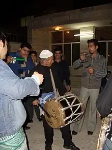 The Dammam ( Arabic الدمام, DMG al-dammām) is a large double-headed cylinder drum or frame drum played by Shias in Iraq and Iran in religious ceremonies. The dammām is usually struck with the left hand and a curved stick in the right hand, especially during passion plays in the mourning month of Muharram or to wake up the devotees early in the morning of Ramadan .
