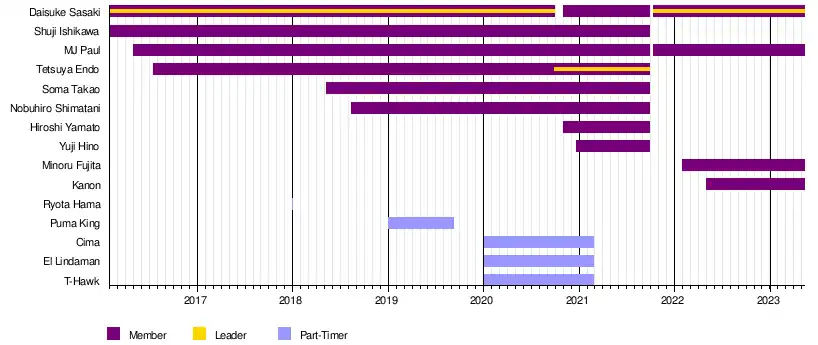 Various members of the unit are known to have made sporadic appearances in other promotions. On June 13, 2017, Ishikawa and Endo teamed up to defeat Nextream (Kento Miyahara and Yuma Aoyagi) on the second night of the Dynamite Series 2017, an event promoted by All Japan Pro Wrestling (AJPW).[37] At Machida Pro-Wrestling Festival Vol. 1, a freelance show promoted by the Japanese independent scene on September 8, 2017, Sasaki and Endo represented the unit as the defeated the team of Speed Of Sounds (Hercules Senga and Tsutomu Oosugi) in a tag team match, as well as Ishikawa teaming up with Masashi Takeda to pick up a victory over Big Japan Pro Wrestling's Daisuke Sekimoto and Yuko Miyamoto.[38] At Great Voyage in Yokohama Vol. 2, an event promoted by Pro Wrestling Noah on December 16, 2018, Nobuhiro Shimatani, who represented the stable, teamed up with Kazusada Higuchi and Kota Umeda in a losing effort to Atsushi Kotoge, Kenoh and Masa Kitamiya.[39] On May 4, 2019, at Mercury Rising, an event promoted by WWNLive, Sasaki, Takao and Endo defeated The Skulk (Adrian Alanis, A. R. Fox and Leon Ruff).[40] At Infinity: 2021 Spring, an event promoted by Active Advance Pro Wrestling (2AW) on February 7, Ishikawa represented the stable as he teamed up with Ryuki Honda in a losing effort to Kengo Mashimo and Tatsuya Hanami.[41]