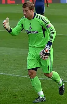 Kennedy remained the starter until Chivas folded after the 2014 Major League Soccer season.[30] He finished in second place for the 2012 MLS Goalkeeper of the Year Award despite Chivas USA's last-place finish and participated in the 2012 MLS All-Star Game.[30][31] In May 2013, he signed a contract extension with Chivas and Major League Soccer through the 2016 season.[32] Francisco Palencia, the Chivas technical director, said of Kennedy at the time of the signing, "He's our captain and our symbol at this moment, so we're very happy to extend this contract."[30][33] Kennedy celebrated his new contract by scoring his first professional goal on May 28, 2013, on a penalty kick in the 2013 Lamar Hunt U.S. Open Cup against Los Angeles Blues.[34]